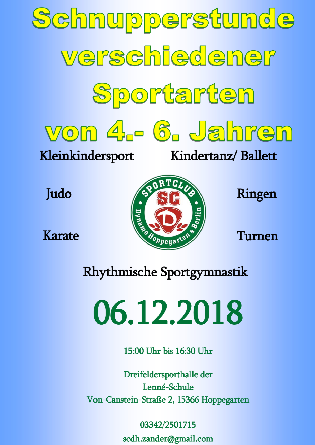 Am 06.12.2018 veranstaltet der SC Dynamo Hoppegarten eine Schnupperstunde, in der verschiedene Sportarten vorgestellt werden. Ihre Kinder können am Donnerstag von 15:00- 16:30 Uhr in die Dreifeldersporthalle der Lenné-Schule (Von-Canstein-Straße 2, 15366 Hoppegarten) kommen und bei Sportarten wie zum Beispiel Judo, Ringen, Karate, Kleinkindersport, Kindertanz/Ballett, Turnen und Rhythmische Sportgymnasik mitmachen. Wir freuen und auf Ihren…